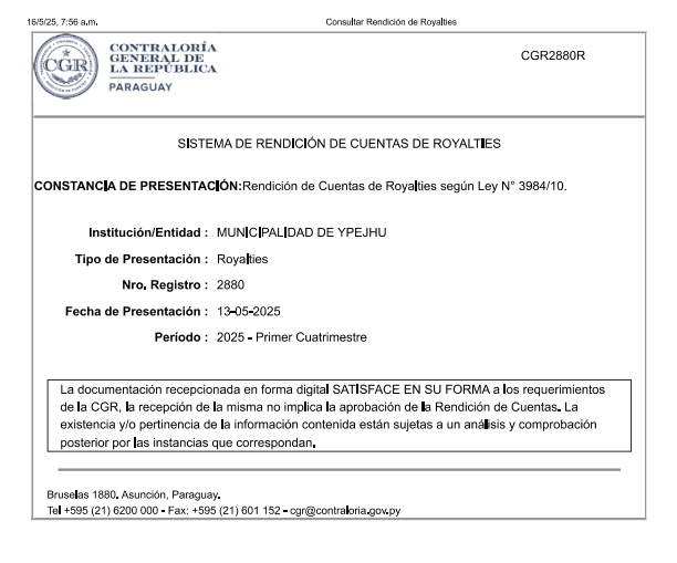 La Municipalidad de Ypejhú realizó la presentación de rendición de cuenta a la CGR, correspondiente al Primer Cuatrimestre 2025, según se emite la CONSTANCIA DE PRESENTACIÓN.-